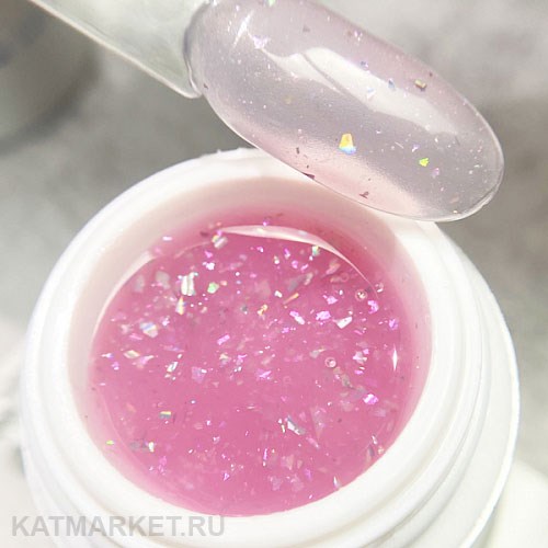 Лёгкий нежно-розовый вуальный гель дополнен хлопьями с невероятным сиянием. Эффект создаётся настолько глубокий за счёт многогранного перелива хлопьев, содержащихся в геле!