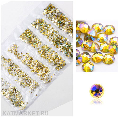 Стразы разных размеров пакет 1600шт, Желтые Голография