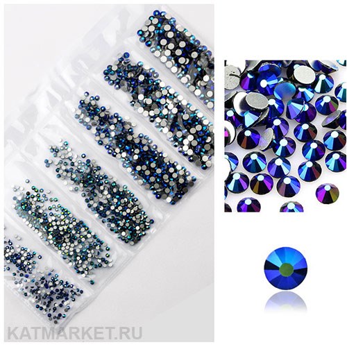 Стразы разных размеров в баночке, Синие Металлик Голография